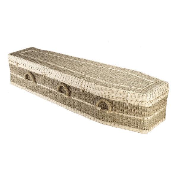 The Pandanus Rounded coffin is made from Pandanus. Pandanus or wild pineapple is an environmentally friendly alternative to seagrass, a plant which grows in the coastal waters of East Africa, Southeast Asia and the Caribbean. Pandanus, it grows rapidly on land even in adverse conditions. When woven it is almost indistinguishable from seagrass. Produced in a Fair Trade company in Indonesia. Made from 100% natural materials. Includes cotton liner, headrest and name plate.Price shown includes Packaging, Delivery and VAT